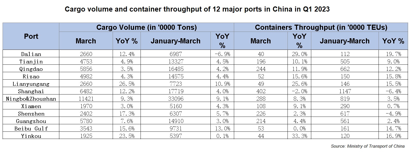 Cảng Ningbo & Zhoushan là cảng container có sản lượng đứng thứ hai ở Trung Quốc với 8,19 triệu TEU, đạt mức tăng 3,5% so với cùng kỳ năm ngoái. Ở vị trí thứ ba, là cảng Thâm Quyến với 6,17 triệu TEU, tuy nhiên với mức giảm 4,9% so với cùng kỳ năm ngoái.